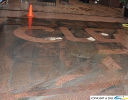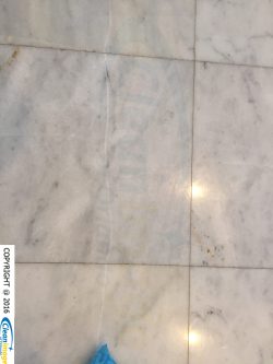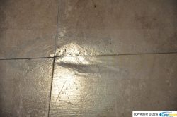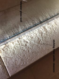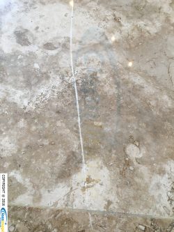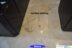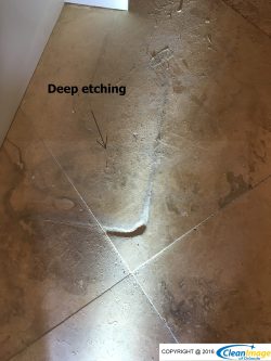 Etching as it relates to Marble, Travertine and Limestone, is when an acid reacts with the calcium carbonate, their primary composition, and literally eats or dissolves the surface. If you spill anything acidic on your natural stone floor, liquid or solid, you run a risk of etching your polished surface. What this is in laymen’s terms is the dissolving of the surface of the stone. This will not only remove the polished shine you once had, however it will also leave the area rough, causing soils to get trapped in the now rough etch and thus outlining it like you see here. The solution depending on how severe, or how deep the etch goes, is diamond hone and re polish to match the surrounding finish. Often if you spill something acid on your Marble, travertine or Limestone, you will readily notice and dark areas. The area will actually be lighter in color with a loss of any shine. As time goes on the rougher texture of the etch attracts soil and the etch will become pronounced. Never use acid based cleaners on natural stone floors, including vinegar(aced-acid).