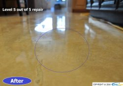 No, all hole repairs are not the same. Often when the incorrect material is used, we have to use small diamond bits to remove bad repairs before filling with good repair material. Here we have an attempt to fill the hole with grout at one point. Then a second company came in and tried to put a layer of epoxy over the hole. To properly repair this hole, all the bad materials have to be removed. We often use tiny diamond bits on Dremel tools to remove bad repairs to allow the right epoxy material to go in.