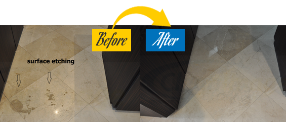 Etching as it relates to Marble, Travertine and Limestone, is when an acid reacts with the calcium carbonate, their primary composition, and literally eats or dissolves the surface. If you spill anything acidic on your natural stone floor, liquid or solid, you run a risk of etching your polished surface. What this is in laymen’s terms is the dissolving of the surface of the stone. This will not only remove the polished shine you once had, however it will also leave the area rough, causing soils to get trapped in the now rough etch and thus outlining it like you see here. The solution depending on how severe, or how deep the etch goes, is diamond hone and re polish to match the surrounding finish. Often if you spill something acid on your Marble, travertine or Limestone, you will readily notice and dark areas. The area will actually be lighter in color with a loss of any shine. As time goes on the rougher texture of the etch attracts soil and the etch will become pronounced. Never use acid based cleaners on natural stone floors, including vinegar(aced-acid).