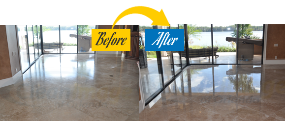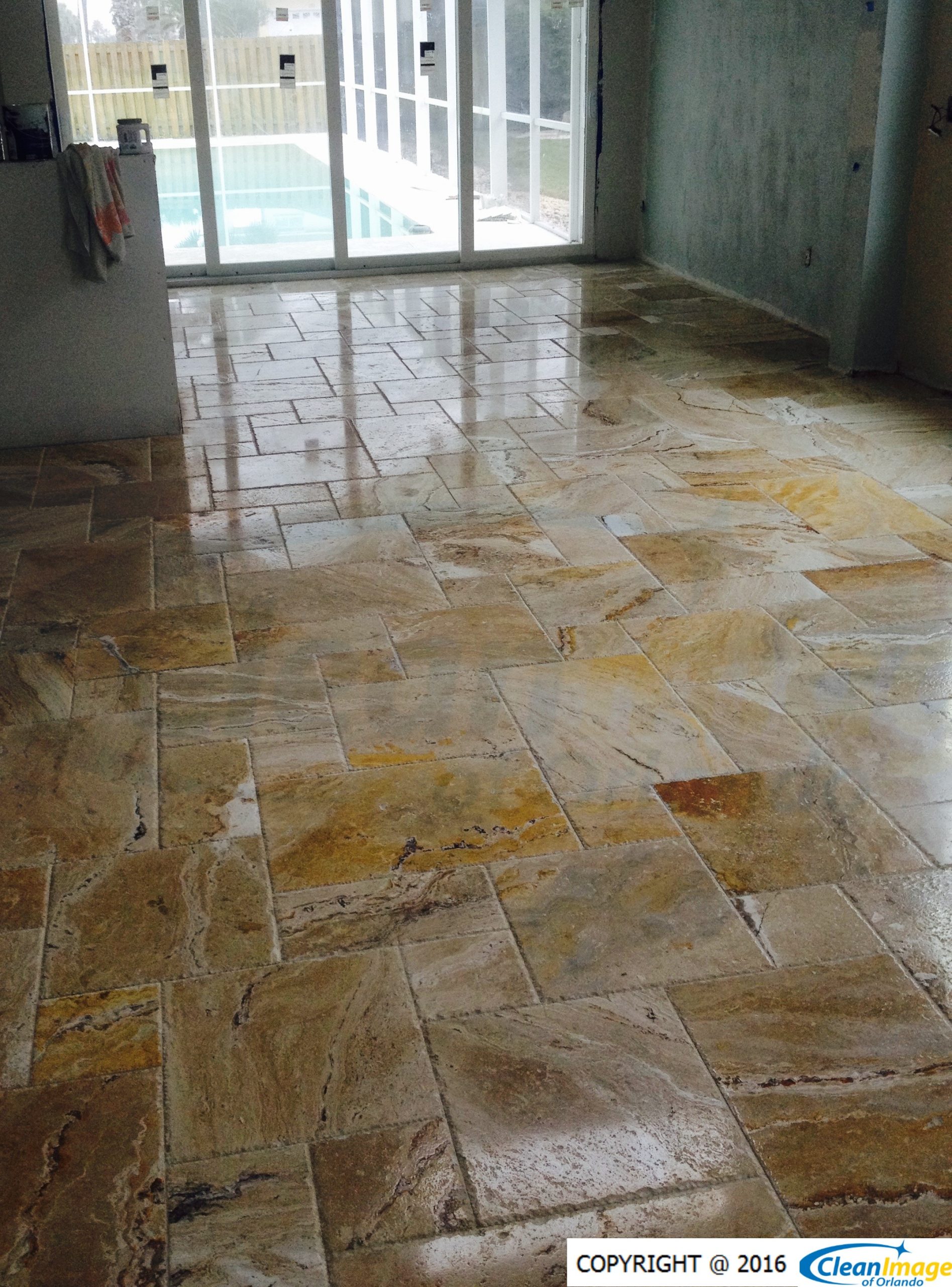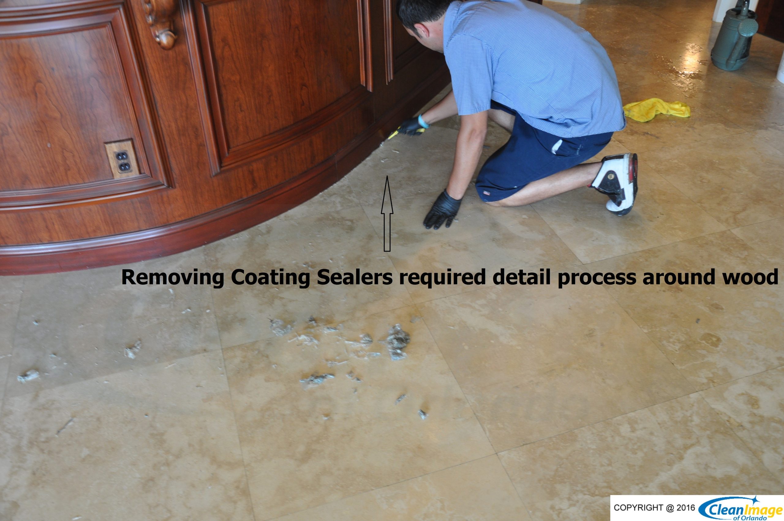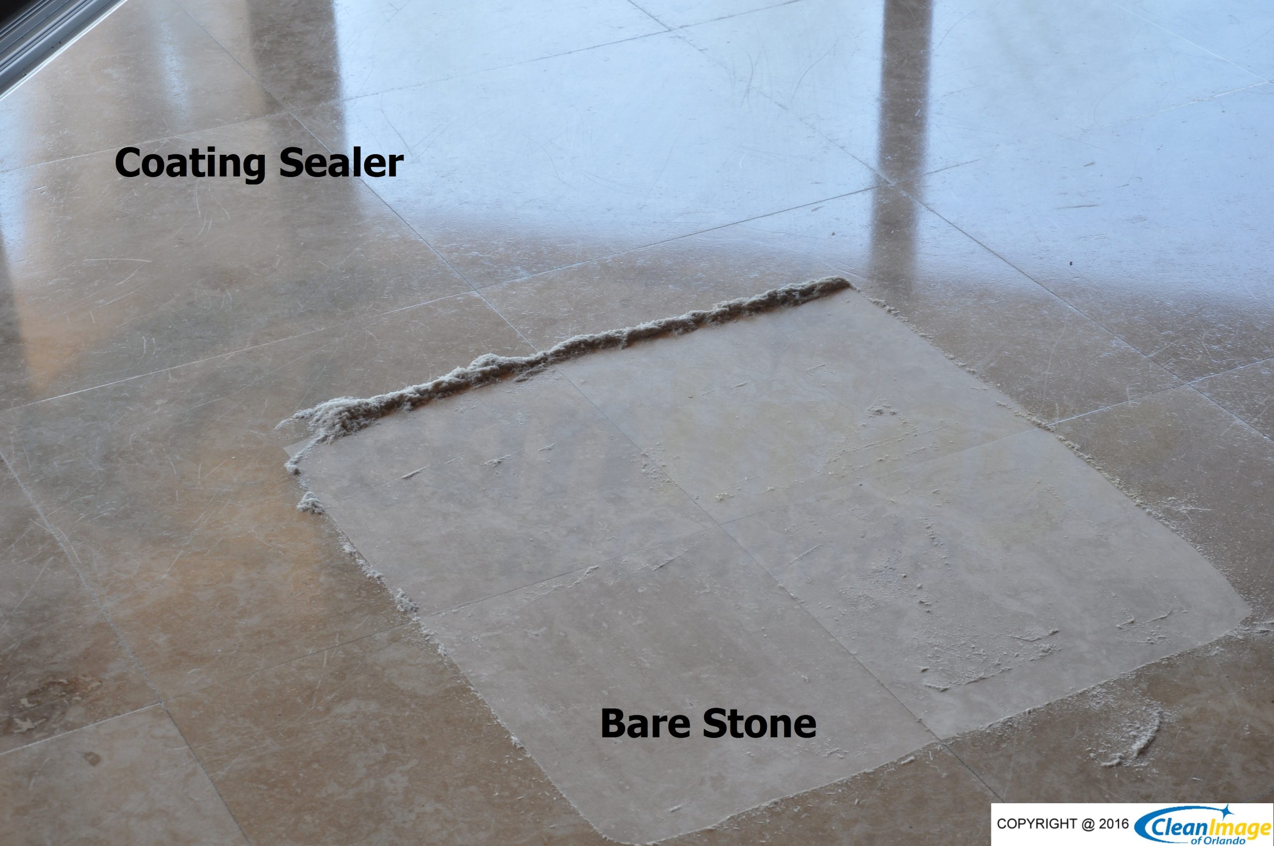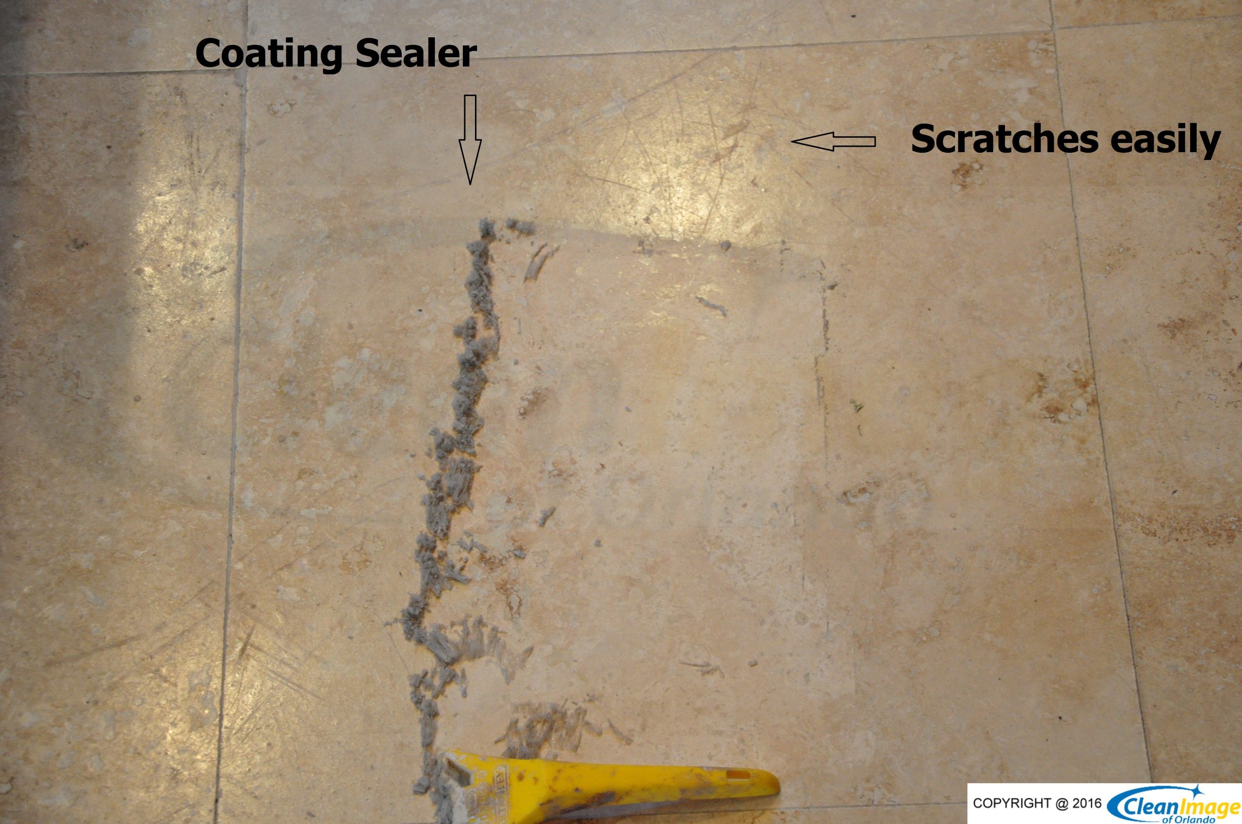 Topical coating sealers on smooth interior stone tend to scratch very easily and “ugly” out very quickly. You would also think the “sealer” would keep the floor cleaner longer, when in fact it gets soiled much faster and when it comes time to clean, you will not be able to. This is because the soil is embedded into the sealer, not on top like you would imagine a topical sealer should work on stone. At this point, to “clean” your floors, we must use a chemical stripper to break down the sealer. Clean Image of Orlando does NOT recommend topical sealers on interior travertine in almost all cases. We recommend penetrate sealers, or impregnating sealer. View the many pictures to see results of topical sealer applications.