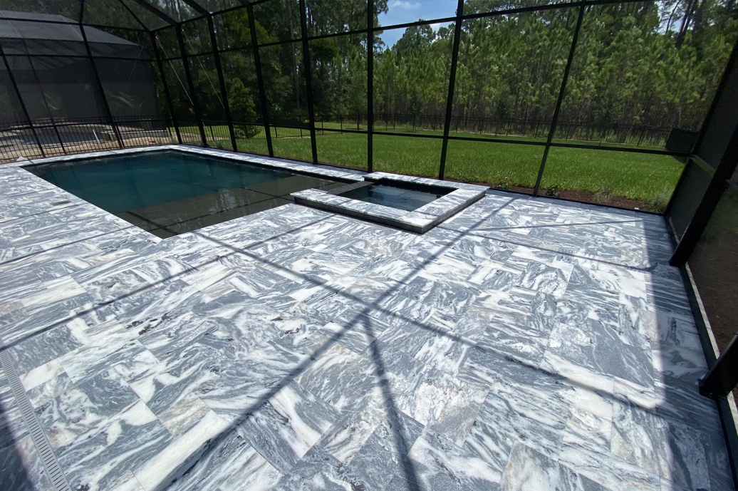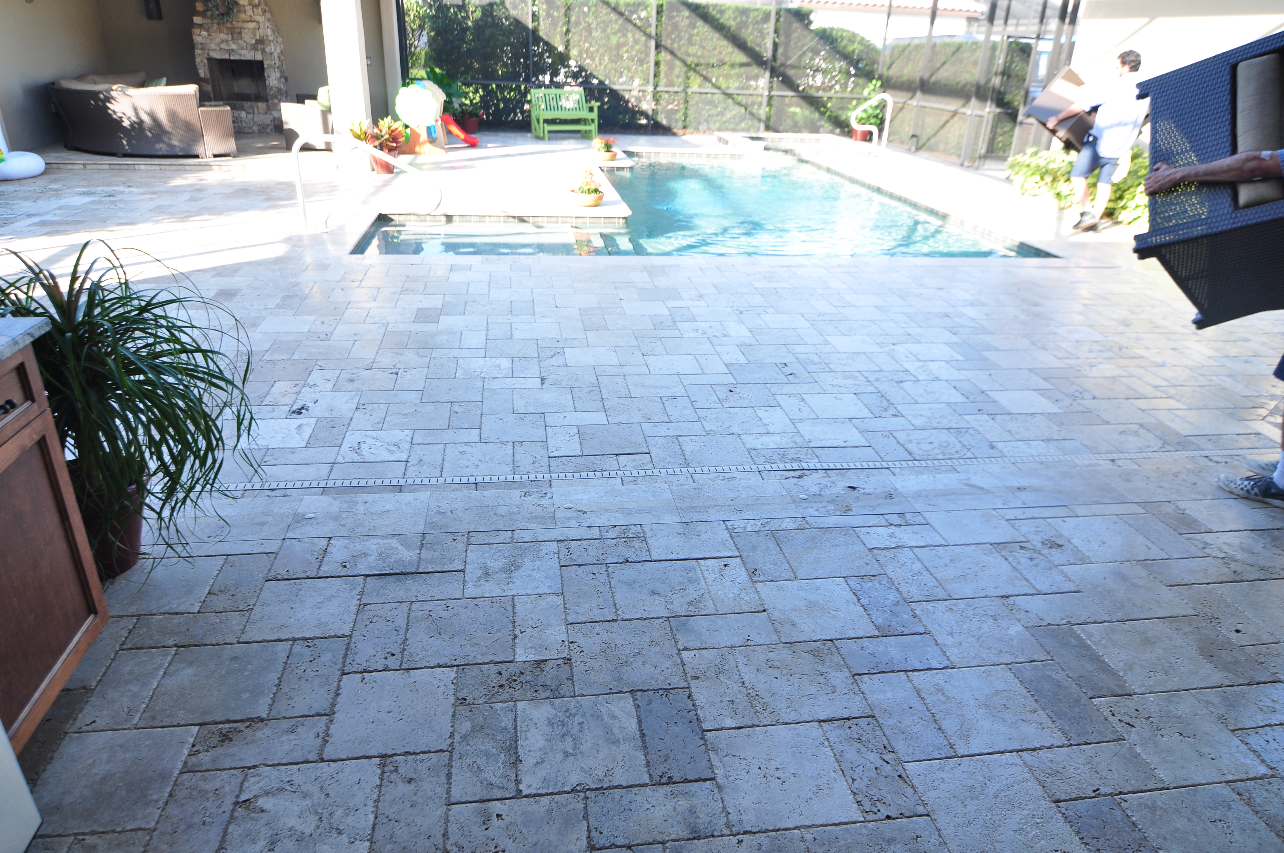 We love restoring Travertine pavers around pool decks as much as we do diamond honing and polishing Travertine inside your home. We treat Travertine differently in an exterior installation as opposed to an interior as demands from each are much different. As you can see from the pictures, Travertine often provides the biggest difference once cleaned, sanded and sealed with Seal N Lock. Travertine is often used on pool decks because it comes in different colors, installation styles, and compliments pools beautifully.