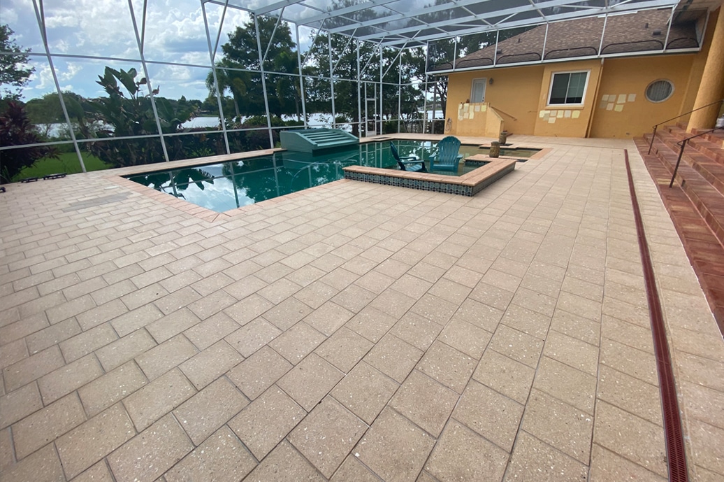 The third is a penetrating/ film-forming sealer. We use Seal N Lock wet look, and it is a 2-part, water-based urethane. The first advantage of this sealer is that it will enhance the colors of the pavers, meaning it will darken the paver like it has been wet with water. The second advantage is that it will harden and lock the sand in between the pavers, and if you have some deeper holes, it will also fill and harden the sand in the deeper holes. This helps keep all the soils/ molds/mildews/algae and other contamination closer to the surface. This will help keep the Travertine pavers looking cleaner longer. It will increase the structural integrity of the installation. The third advantage is the sealing capability of Seal N Lock. It forms a barrier between the Travertine and soiling and staining, so your Travertine looks cleaner longer. Porous Stone such as Travertine can absorb liquids, chemicals and spilled drinks. Sealing will prevent the absorption into the stone. This is especially true in areas of your deck that may not receive a lot of sun, or stay wet, as mold and mildew will gain hold and bloom under those conditions. Maintenance cleanings are much easier. The fourth advantage is increased shine. Most jobs we will apply 2 heavy applications that will achieve a low gloss appearance. We apply an aggregate in the last coat to mitigate the chance of slip and fall. Ask to see one of our sample pieces. The aggregate will leave a slight texture like fine sand paper. It will not be rough on the feet like some that will use actual sand. Depending on your individual level of shine goals, paver age, absorbency rate, texture, and how many coats are applied will dictate the finial sheen level. We typically recommend 2 coats that would provide a satin to low gloss depending on lighting angles and surface of the Travertine. Seal N lock allows vapor transmission, which is important in Florida so you do not trap moisture, possibly causing the classic white, or clouding of the pavers.