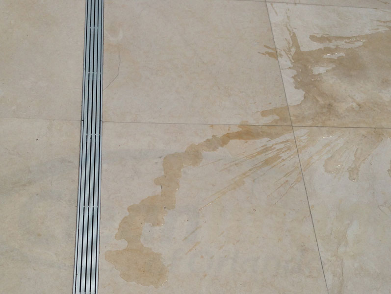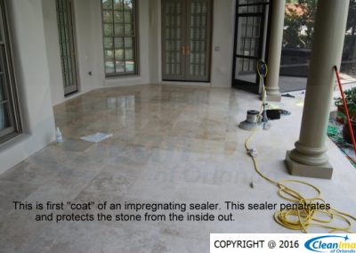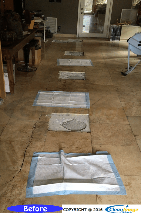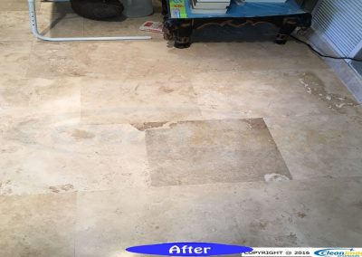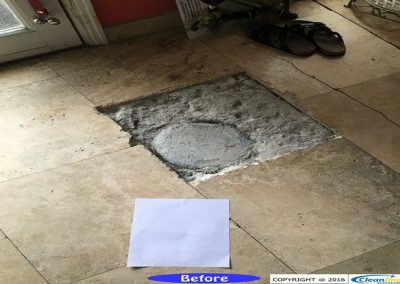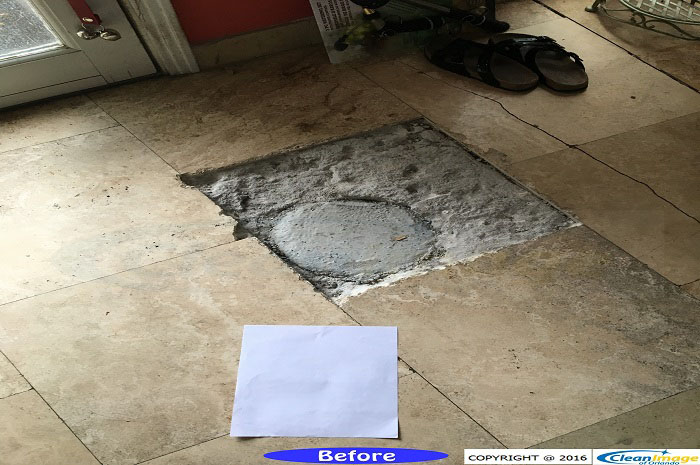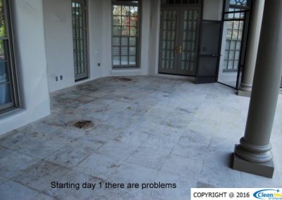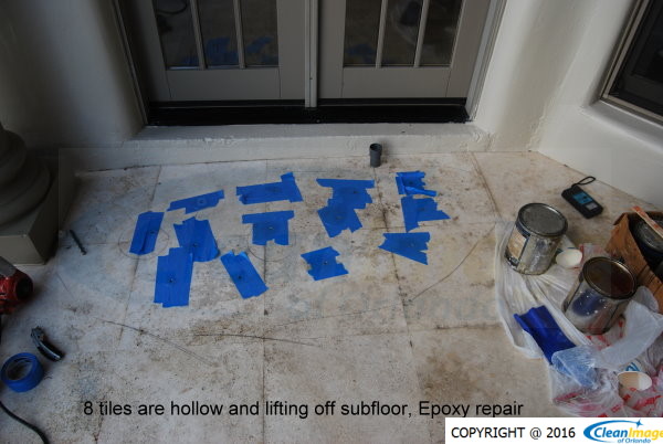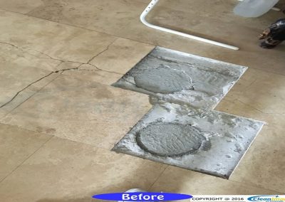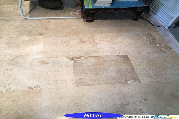This travertine was not only stained, about 8 tiles were completely lifted from the foundation. Clean Image of Orlando was able to re-bond the floating tile by drilling holes in strategic areas and injecting epoxy underneath the tiles and then weighting the area to re-bond.