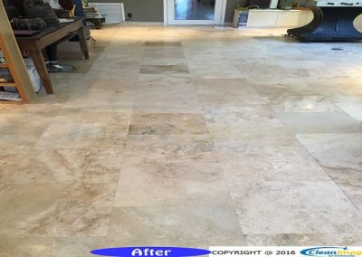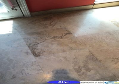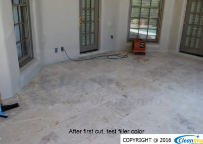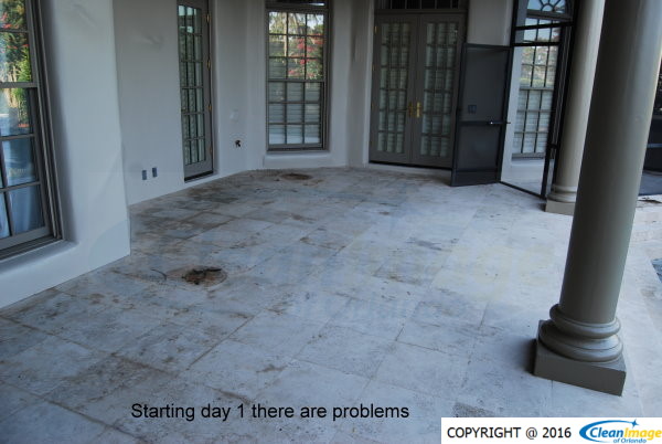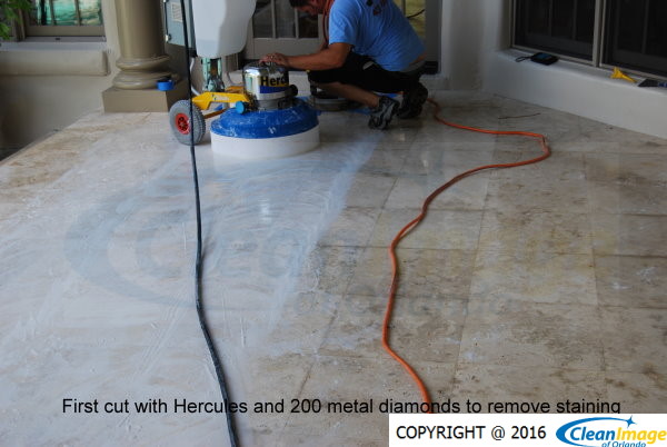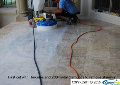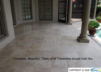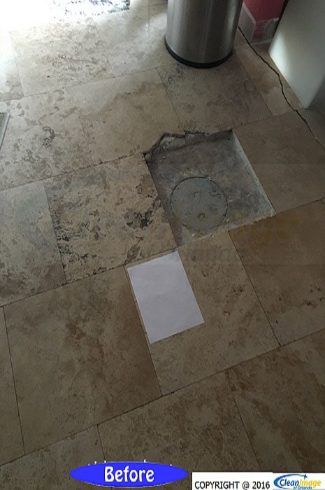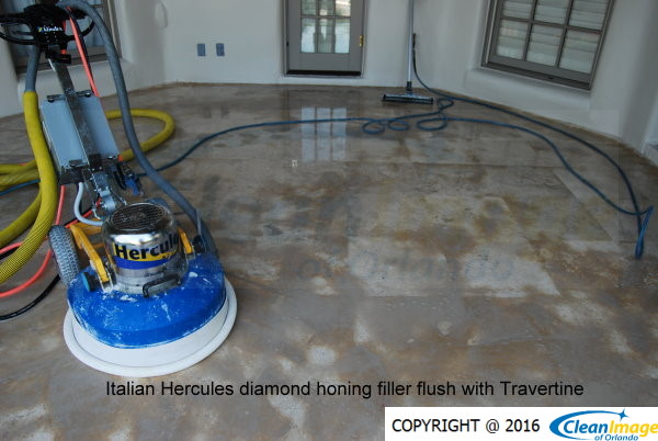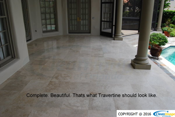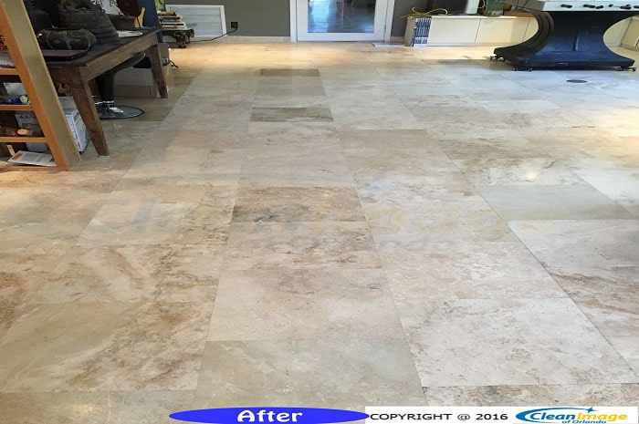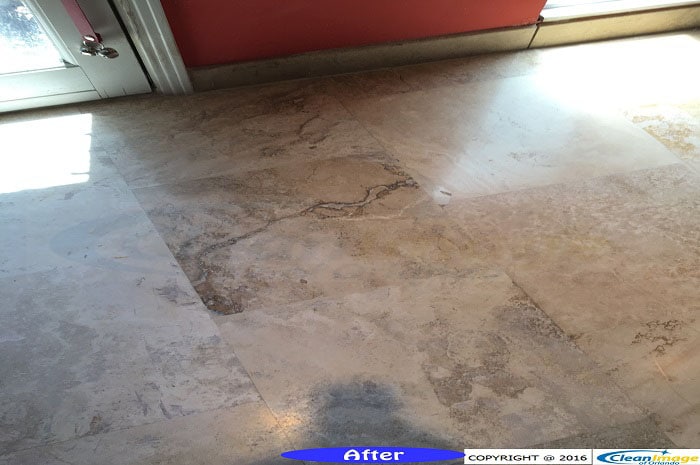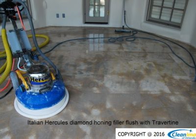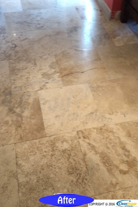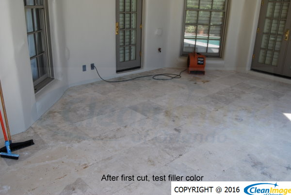 In doing so, many of the travertine edges were chipped and damaged. Clean Image of Orlando was hired to find replacement tile, install, and grind in place the replacement tiles so as the floor was all one level.