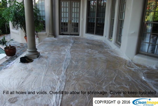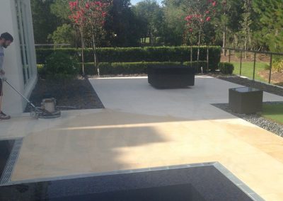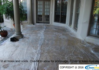 The travertine deck was ground flat and then deep cleaned and treated to remove the mold and mildew that was growing in the stone. Then the entire deck was over-filled with a modified cementitious grout, covered with plastic, and allowed to harden.