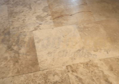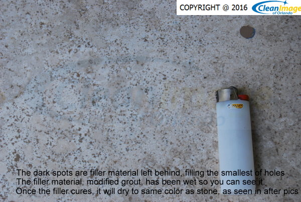The next day the excess filler was diamond honed using special rigid diamond so as the filler was removed from the travertine surface without removing it from the holes. As you can see from the picture, it properly fills even the smallest of holes. The process then continues with additional diamond honing until a hi-hone finish was achieved.
