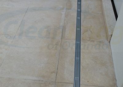 The problem you can see is the tiles were not pitched correctly and the salt water would sit on the limestone tiles and corrode the tiles. Clean Image of Orlando was hired to grind the area between the 2 drains to allow proper draining of the water.