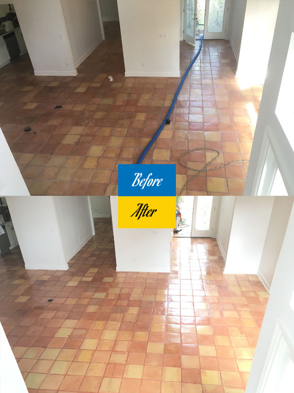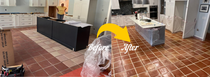This kitchen remodel left new Mexican tile that didn’t match the original floor — until Clean Image stepped in. We deep-cleaned the existing tile to reveal its true color, then used custom dyes, sealers, and grout color sealing to blend everything perfectly. Now you can’t tell where the 20-year-old tile ends and the new section begins!